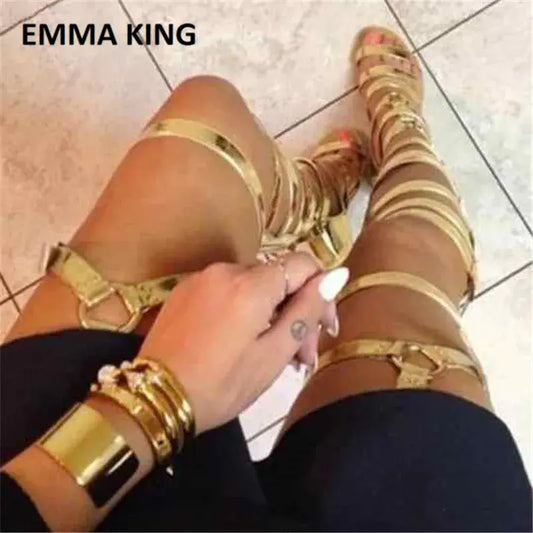 Summer Fashion Women Buckles Boots Over The Knee Boots Ladies Sexy Flat Boots Female Gladiator Boots Gold Leather Party Shoes