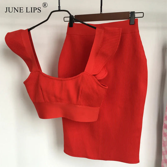 JUNE LIPS 2022 New Ladies Mini Skirt Sleeveless Ruffle Vest Tight Bandage Two-Piece Set High-End Women's Clothing Wholesale