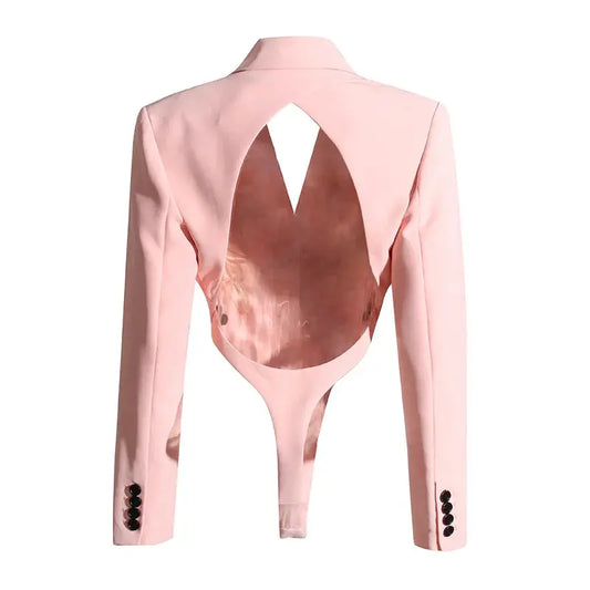 PREPOMP 2022 Autumn New Arrival Long Sleeve Turn Down Collar Hollow Out Backless Padded Shoulder Slim Pink Blazer Coat GH002