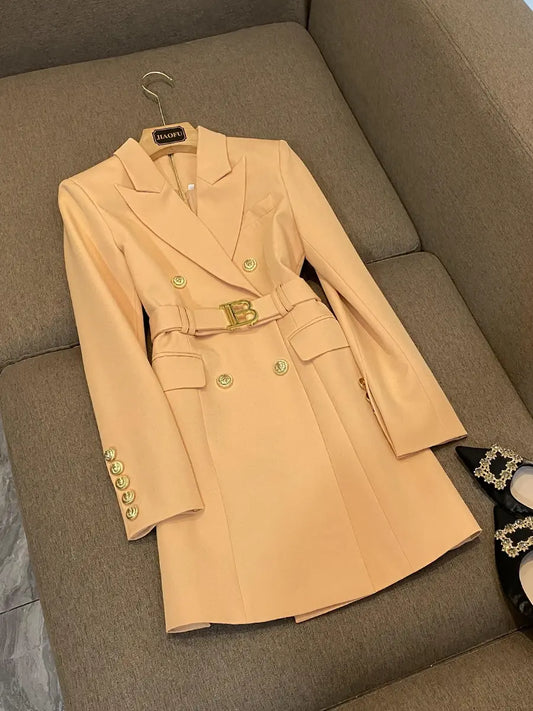 JUNE LIPS 2022 Top Quality Women Blue White Red Green Brown OL Office Blazer Dress with Belt Spring Design New Luxury Buttons