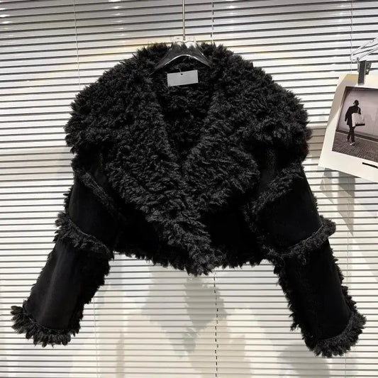 PREPOMP 2022 Winter New Collection Long Sleeve Big Turn Down Collar Faux Fur Leather Black Pu Jacket Women Blazer Coat GH141