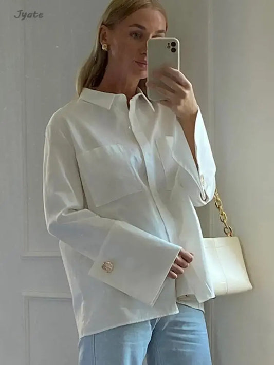 Jyate Fashion Woman Blouses 2024 Elegant Lapel Long Sleeve Office Lady Shirts Casual Loose White Pockets Tops Female Clothing
