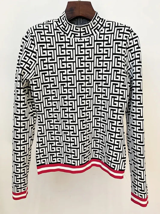 HIGH STREET Newest 2024 Designer Fashion Women Color Block Ribbons Geometric Monogram Jacquard Knit Pullover Sweater