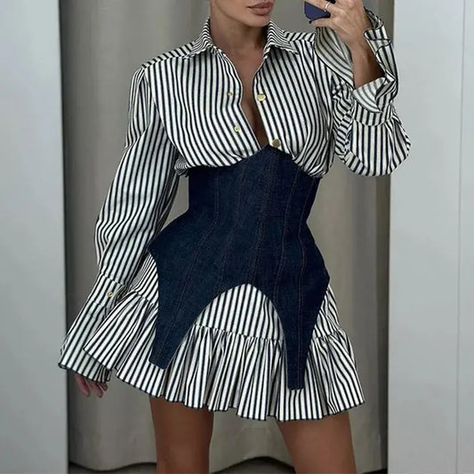 New Spring Office Long Sleeved Mini Dresses Elegant Striped Button Slim Shirt Dress Women's Casual Lapel Pleated Patchwork Dress