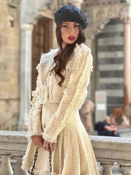 High Quality Fashion Tassel Design Two Piece Sets Women Outfit Long Sleeve Short Jacket Coat + Pleated Skirt Suits Autumn/Winter