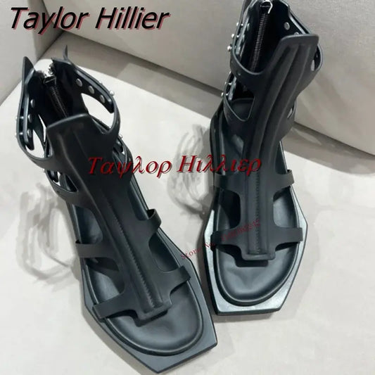 Sponge Cake Thick-Soled Hollow Roman Sandals Metal Rivets Belt Buckle Back Zipper Open-Toed Women'S Shoes Fashion All-Match 44